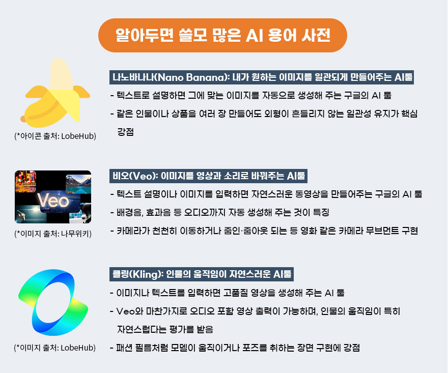 이 과정에서 가장 중요한 것은 ‘일관성’입니다. 홈쇼핑은 실제 상품을 판매하는 채널이기 때문에, AI가 만들어낸 이미지 속 상품이 고객이 실제로 받아보는 상품과 동일하게 표현되어야 하거든요. 그래서 이미지 생성에는 일관성 유지에 강점이 있는 구글의 나노 바나나(Nano Banana)를, 영상 생성 단계에서는 자연스러운 오디오 출력까지 지원하는 구글 비오(Veo)와 클링(Kling)을 주력으로 활용하고 있습니다.