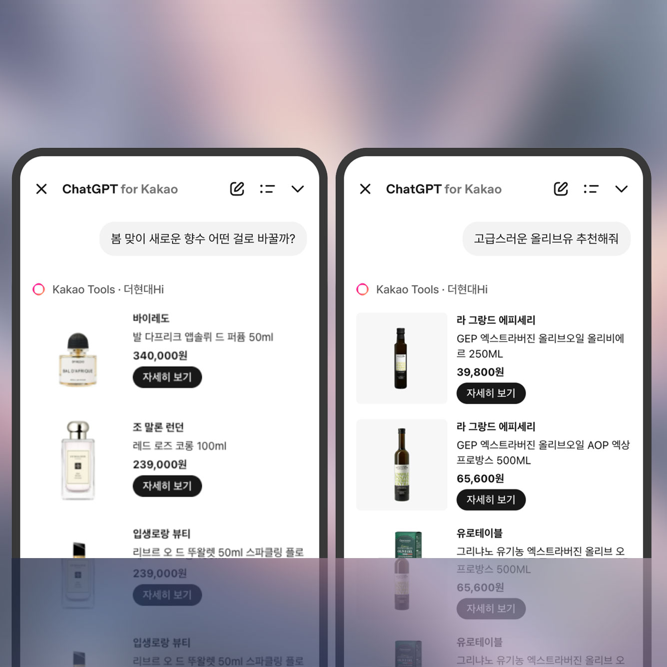백화점은 지난 7일 ‘카카오툴즈(Kakao Tools)’에 더현대 하이(Hi)가 프리미엄 e커머스 영역 파트너사로 합류했다고 발표했습니다. 카카오툴즈는 카카오톡 채팅탭 상단에 위치한 ‘ChatGPT for Kakao(챗지피티 포 카카오)’에서 이용할 수 있는 기능으로, AI가 이용자와의 대화 맥락을 분석해 뷰티·패션·여행·취업 등 다양한 생활 영역의 외부 서비스 정보를 불러와 대화창에 띄워주는 방식으로 구동됩니다.