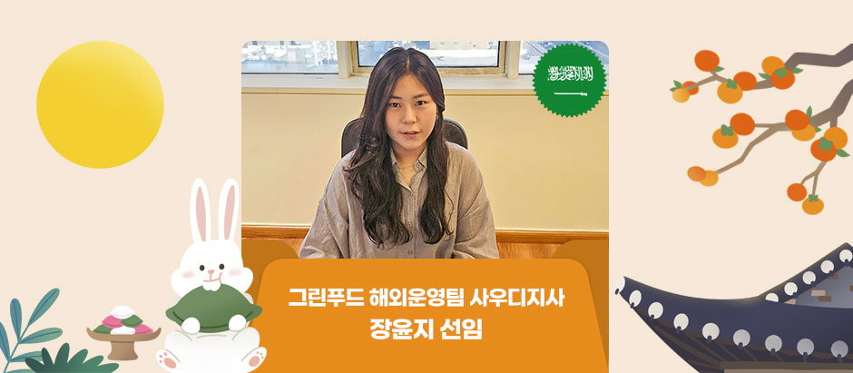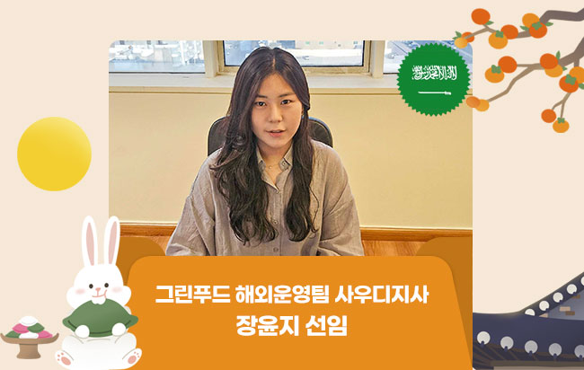그린푸드 사우디지사의 장윤지 선임, 추석 인사드립니다. 저는 올해 봄부터 현장에 합류해 지사의 자금 관리와 정부·은행·협력업체와의 소통을 통해 전반적인 운영을 지원하고 있습니다.