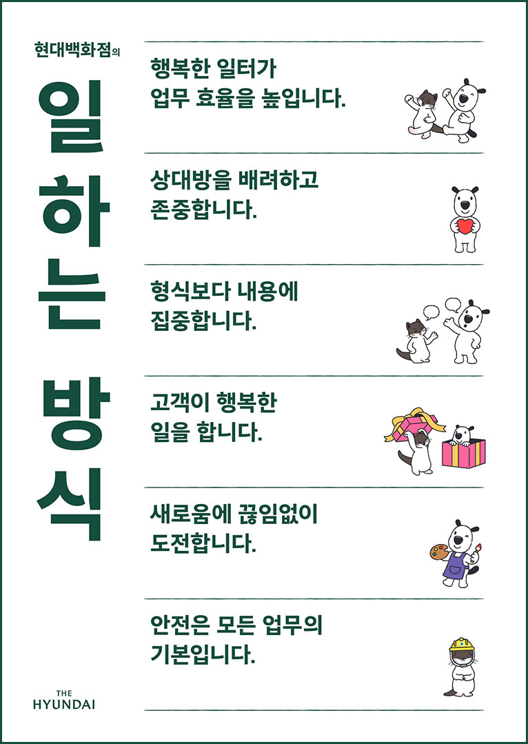 조훈상 선임 이번에 백화점의 ‘일하는 방식’ 6가지를 선정했잖아요. 당장 급격한 변화는 어렵겠지만, 각자 자리에서 지금보다 조금만 더 적극적으로 시도하면 수평적 조직문화를 충분히 만들어갈 수 있다고 생각해요. 모두가 참여하면 분명히 바뀔 겁니다.