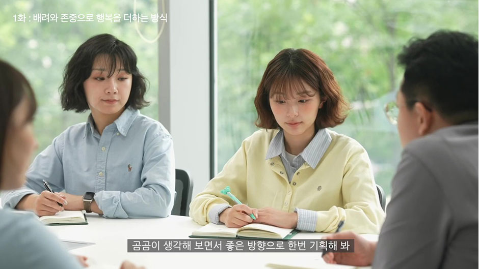 기경용 책임 저는 이번 웹드라마를 ‘일하는 방식’ 다섯번째 슬로건인 ‘새로움에 끊임없이 도전합니다’의 실천으로 보고 싶어요. 사내 연기자가 출연하는 교육 콘텐츠 제작 자체가 인재개발원에도 하나의 ‘도전’이었죠.