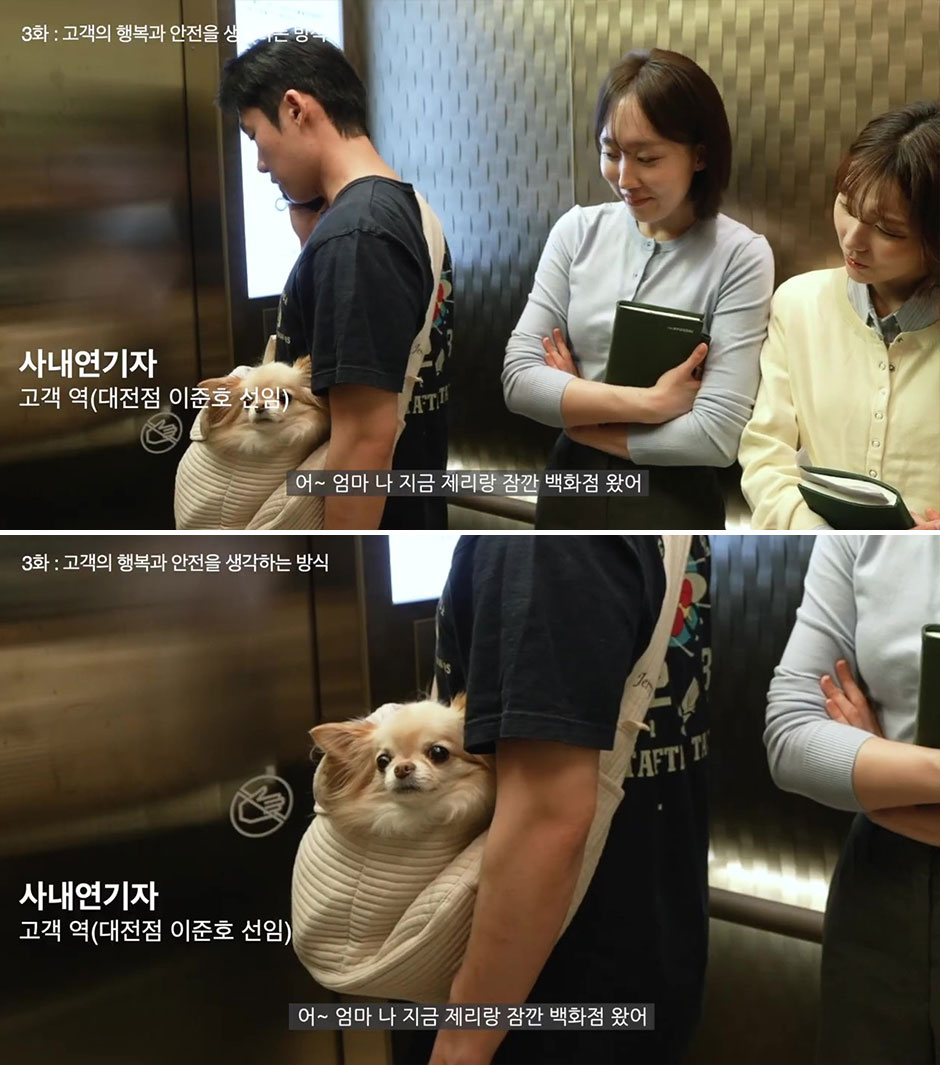 특히 반려견과 함께 백화점에 방문하는 고객 역할이었던 이준호 선임은 본인 반려견 ‘제리’를 실제로 데리고 왔어요. 덕분에 훨씬 자연스러운 장면이 나왔고, 밤늦은 촬영으로 다소 지쳐 있던 현장 분위기도 제리의 등장 덕분에 확 밝아졌습니다.