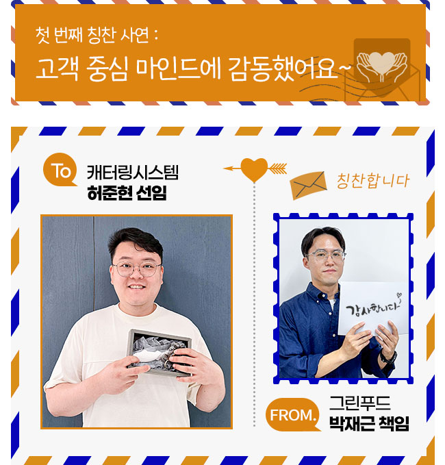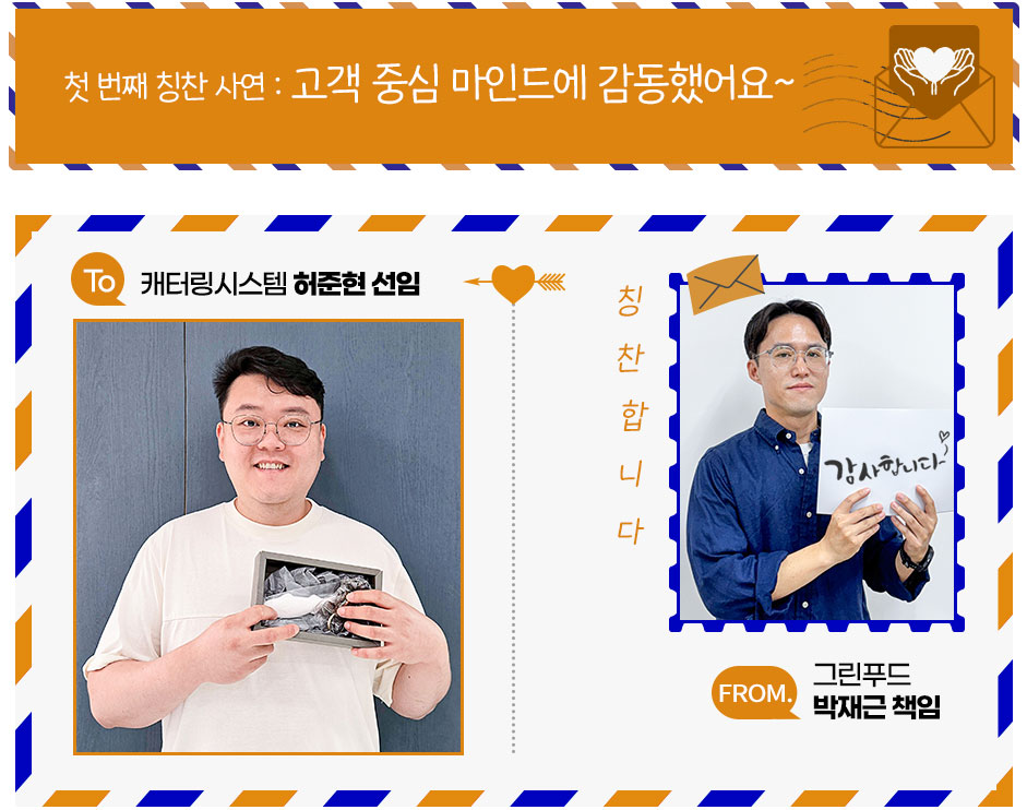 항상 밝은 미소로 구매팀과 소통해 주시는 허준현 선임님 감사합니다. 고객사 행사인 푸드트럭 이벤트를 진행할 때, 구매팀에 다양한 샘플을 요청하고 수차례 사전 테스트를 거치며 재료를 선정하시는 모습이 인상적이었습니다.