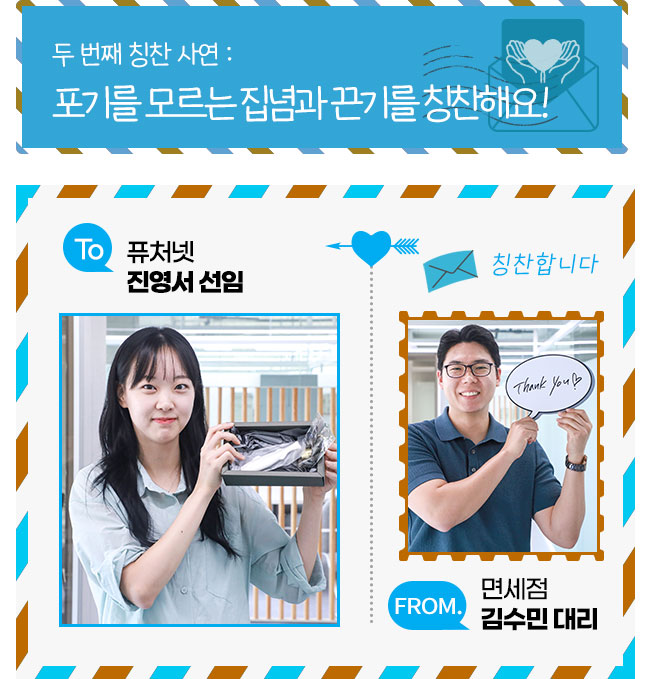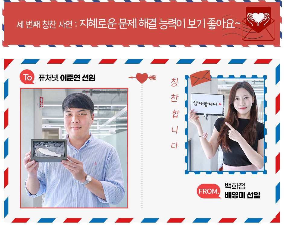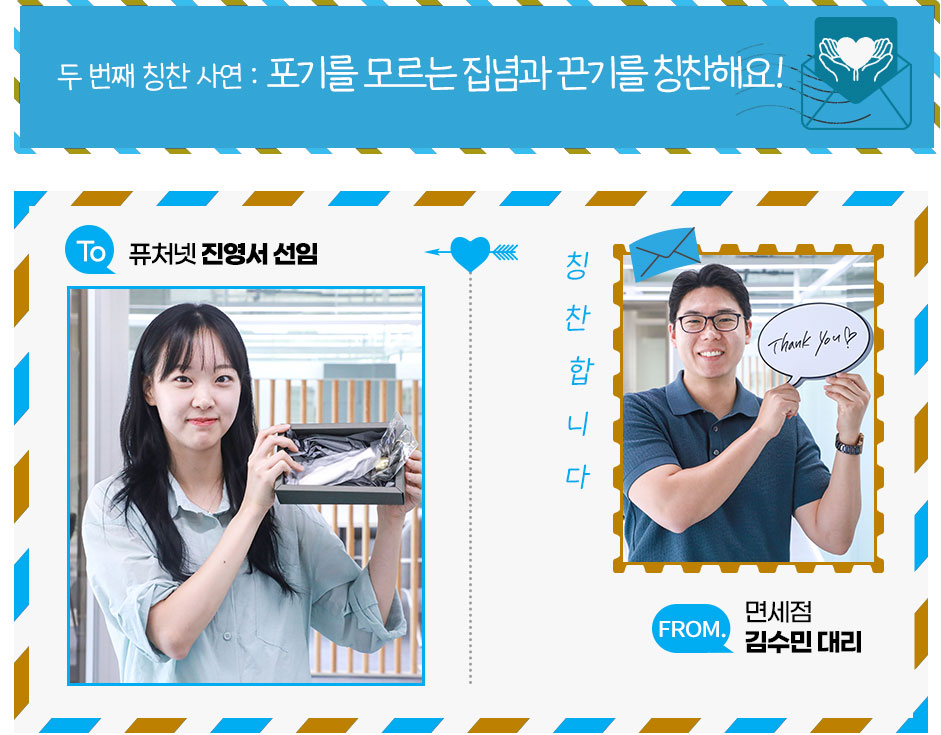 한 달이라는 긴 행사 동안 묵묵히 본인의 업무를 하시며 뜨거운 열정을 보여주셔서 널리 알리고 싶었는데, 이번 기회를 통해 소개할 수 있어 기쁘네요. 고객 지향 마인드로 항상 더 나은 방향을 고민하는 모습이 너무 보기 좋고요, 앞으로도 지금처럼 현장의 목소리를 계속 들려주세요!