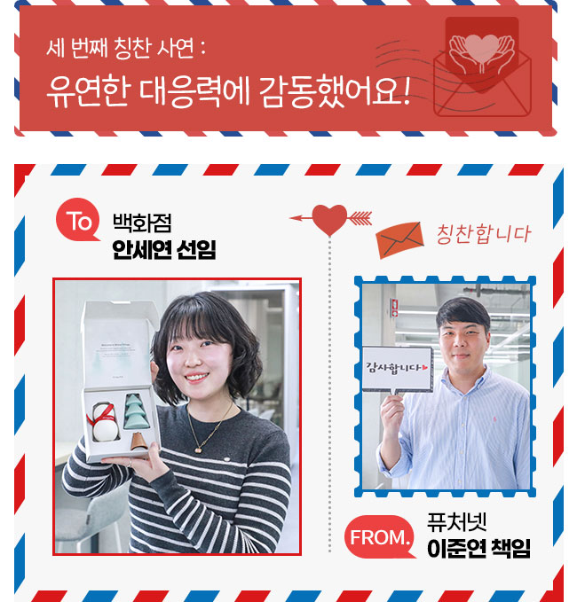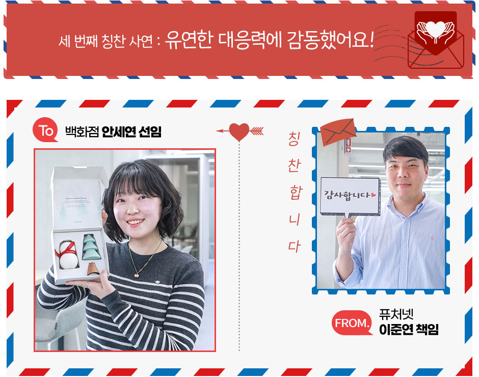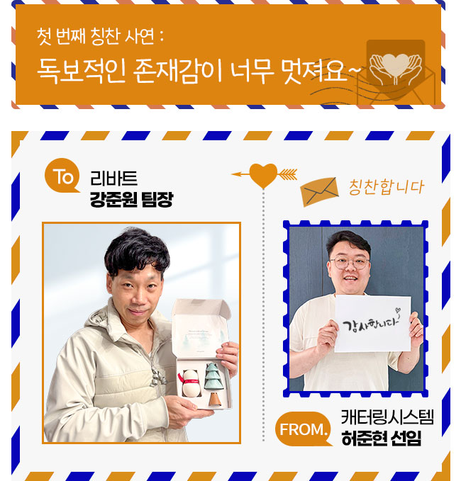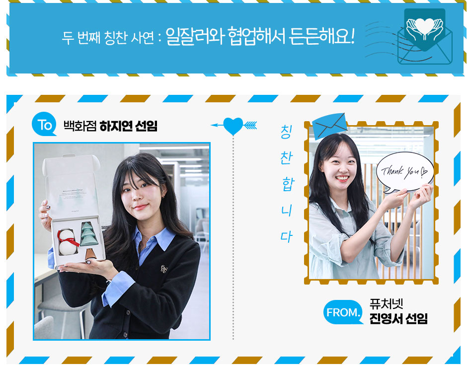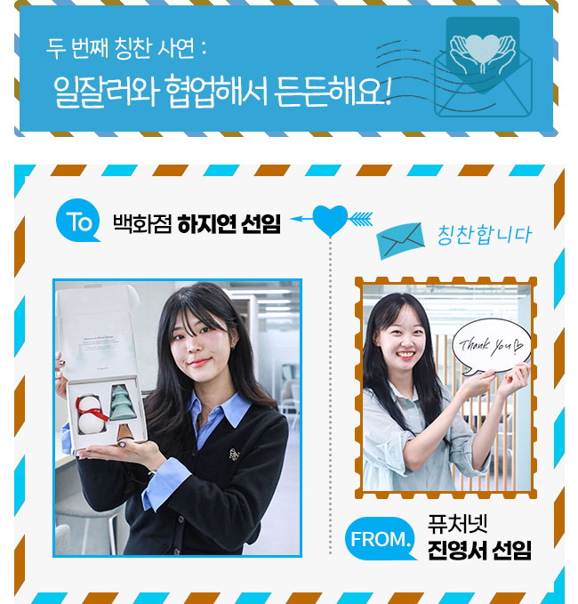 무엇보다 실무 담당자들의 입장을 세심하게 배려하는 특유의 소통 스킬은 제가 생각하는 팀장님의 최대 장점인데요. 그런 모습이 계열사 담당자들에게도 와닿았는지, 담당자들 사이에서 팀장님의 칭찬이 자자합니다.