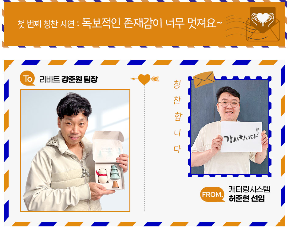 리바트에서 확실하고 묵묵히 협조해 주신 덕분에 오늘도 현장이 매끄럽게 돌아갑니다. 조용하지만 밝게 빛나는 팀장님의 모습에 박수를 보냅니다!