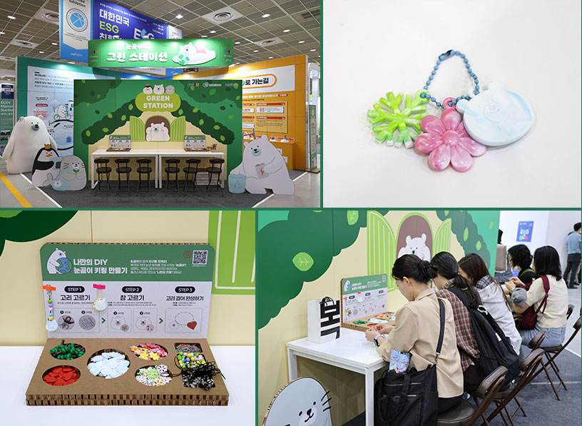 지난해 9월 환경부가 개최한 ‘2025 ESG 친환경 대전’에서는 홈쇼핑의 ESG 마스코트 ‘눈곰이’를 활용해 ‘눈곰이의 그린스테이션’ 콘셉트로 부스를 꾸몄습니다. 부스 디자인부터 체험 프로그램 구성, 스토리텔링까지 팀원들이 하나하나 직접 기획했고, 업사이클링 브랜드 ‘노플라스틱선데이’와 협업한 ‘눈곰이 DIY 키링 만들기’도 큰 호응을 얻었습니다.