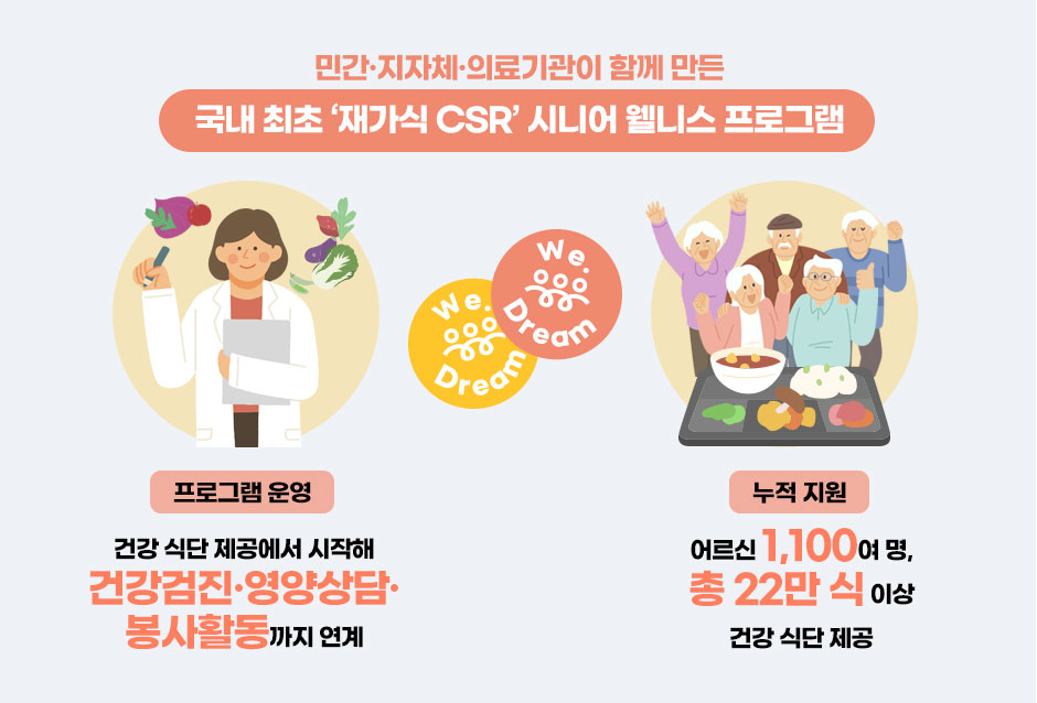 ‘시니어 웰니스 프로그램’은 2023년부터 그린푸드가 지자체, 의료기관과 협력해 운영하는 국내 최초의 재가식 기반 CSR 프로그램입니다. 독거노인 어르신들께 건강 식단을 제공하는 활동으로 시작해, 현재는 건강검진과 영양상담, 임직원 봉사활동까지 연계한 시니어 특화 사회공헌활동으로 발전해 왔습니다.