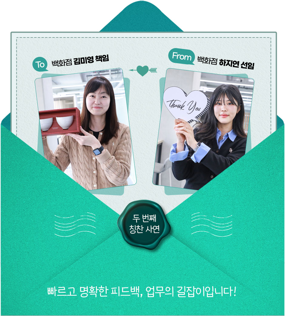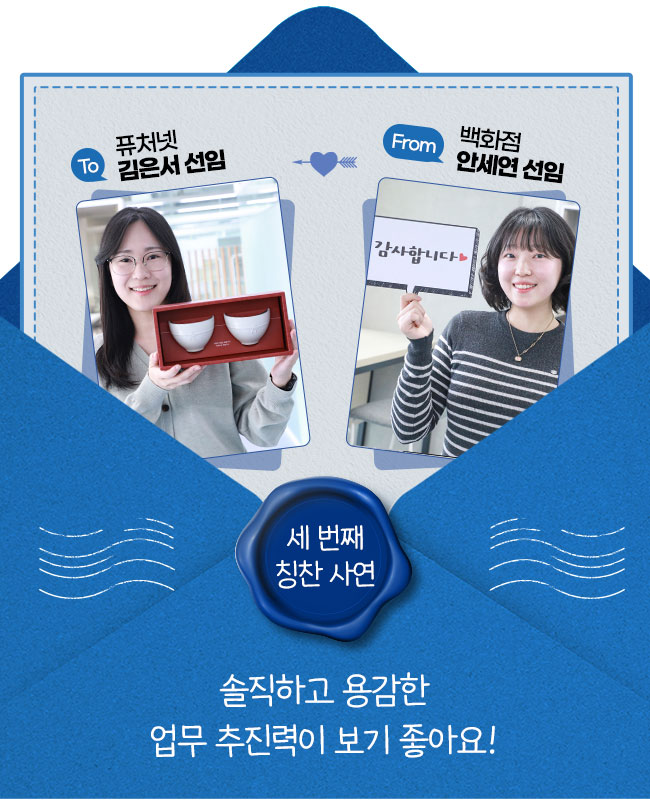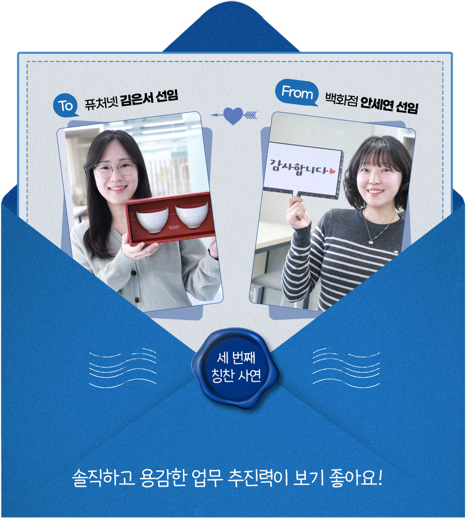 힘든 상황에서도 저를 배려해 묵묵히 제 몫을 다하며 혼자 고민하셨을 선임님을 생각하면 미안하고 고마운 마음이 큽니다. 선임님과 함께 일해서 저는 참 행복한데요. 선임님도 저와 함께하며 더 행복해질 수 있도록, 앞으로 제가 더 잘하겠습니다!
