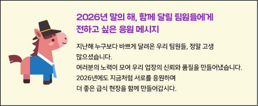 요즘 가장 큰 이슈는 동절기 위생 점검 준비입니다. 식중독 예방과 안전한 급식을 위해 조리 환경과 위생 관리에 더욱 신경 쓰고 있으며, 평소에도 철저한 위생 기준을 유지해 온 만큼 점검도 차분하게 준비하고 있습니다.