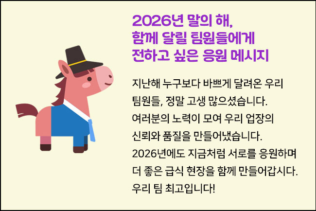 바쁜 급식 현장에서 늘 최선을 다하는 팀원들에게 작은 휴식과 응원의 시간을 선물하고 싶어 신청했습니다. 특히 동절기 위생 점검 준비로 모두가 긴장하고 있는 시기라, 간식타임을 통해 서로를 격려하며 힘내고 싶었습니다.